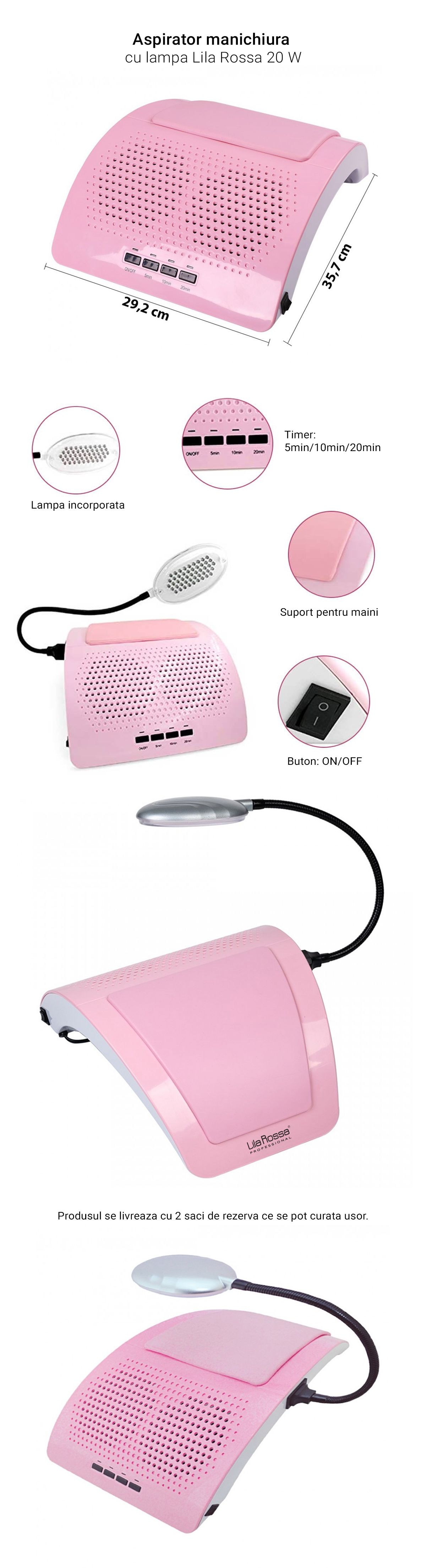 Aspiratorul profesional de praf pentru manichiura Lila Rosa are 3 timpi de temporizare, 5, 10 si respectiv 20 min si este utilizat pentru colectarea prafului ce rezulta in urma pilirii unghiilor tehnice. Datorita motoarelor foarte puternice, este foarte indicat pentru a nu inhala praful rezultat in urma pilirii unghiilor, astfel ca iti asigura igiena la masa de lucru.