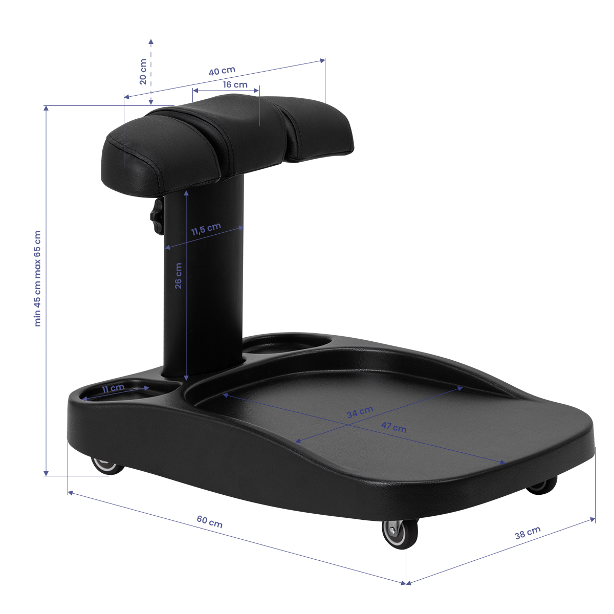 Suportul pentru picioare este format din trei părți, dintre care cea din mijloc este extensibilă. Reglarea manuală a înălțimii permite să fie ridicat cu maximum 20 cm. Toate elementele suportului pentru picioare sunt tapitate cu piele sintetică, ceea ce asigură rezistența la umiditate și ușurința în curățare. În consecință, trolerul poate fi ajustat la nevoile individuale ale utilizatorului, ceea ce îl face o soluție excelentă atât pentru tratamentele cosmetice, cât și pentru cele podologice, asigurând confortul și precizia lucrului în diverse poziții.