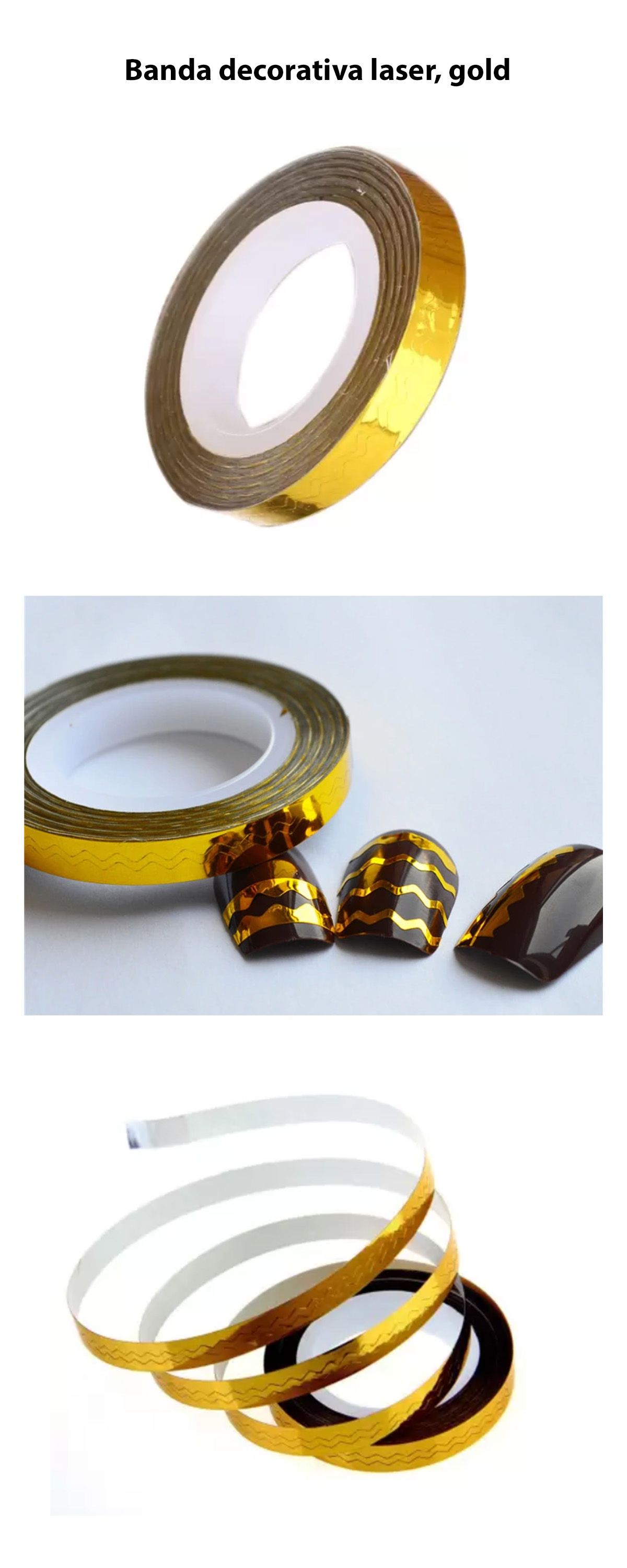 Banda decorativa este un accesoriu, care ajuta la realizarea unui model special de nail art. Aceasta se aplica cu usurinta pe unghii, fiind ideala pentru a realiza rapid si usor o manichiura spectaculoasa. Banda poate fi utilizata atat pe unghiile naturale, cat si pe cele artificiale, realizate pe baza de gel, oja semipermanenta sau acril. Banda decorativa este compatibil cu orice tehnica de nail art. Datorita faptului ca este autoadeziva banda este usor de aplicat, fiind potrivita atat pentru persoanele fara experienta, cat si pentru profesionisti. Banda se poate taia in functie dimensiunile dorite.