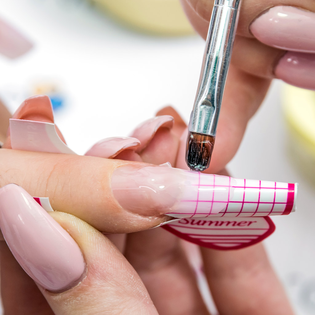 Folosește o pensulă pentru a aplica un strat subțire de gel, acril sau polygel pe unghia naturală, prelungind aplicarea pe șablon până la lungimea dorită. Creează structura unghiei conform formei dorite (pătrată, rotundă, stiletto etc.). Dacă folosești gel sau polygel, usucă-l sub lampă UV/LED conform instrucțiunilor producătorului.