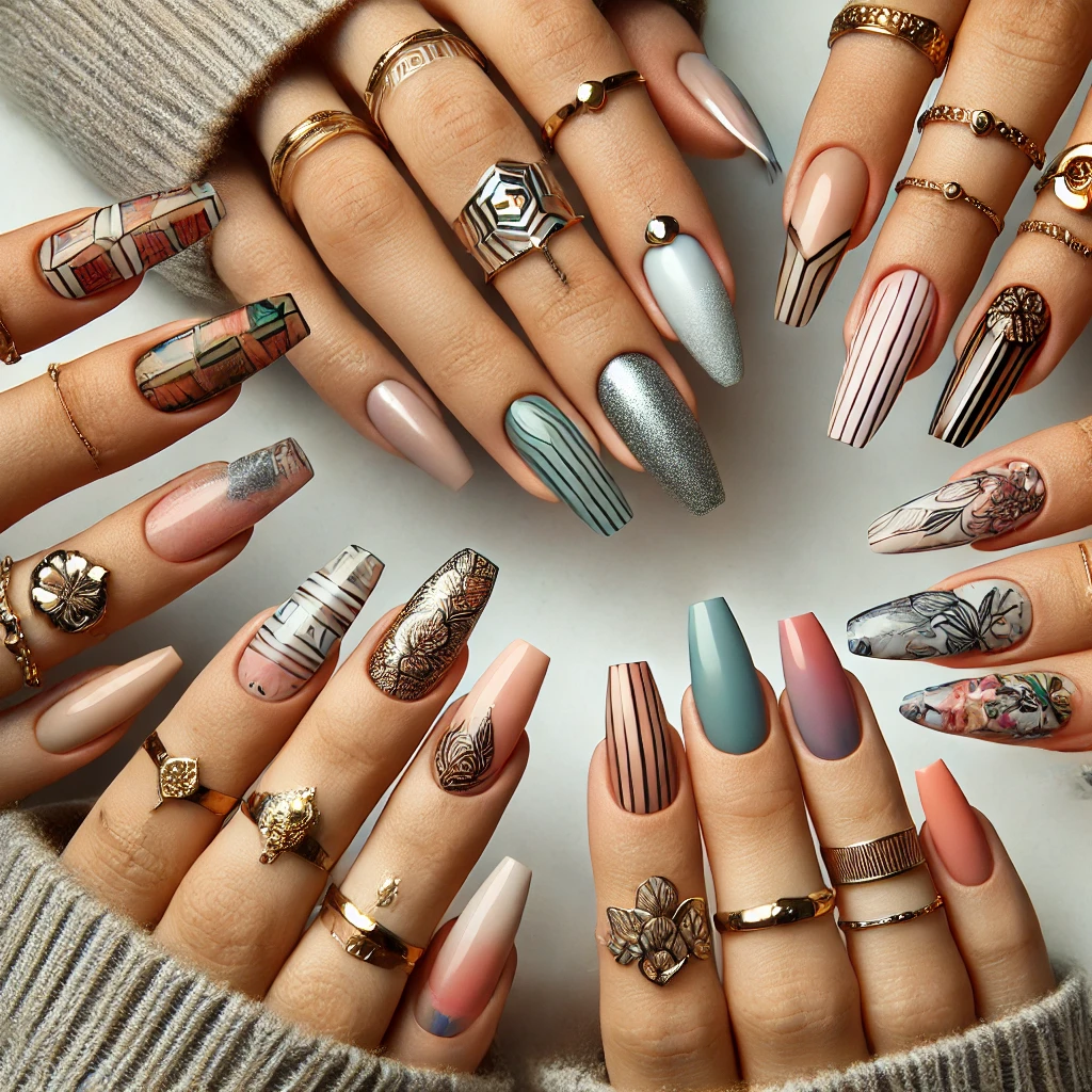 Nuanțele nude rămân în trend și în 2024, dar sunt îmbogățite cu accente metalice pentru un plus de rafinament. Lila Rossa propune unghii cu gel în nuanțe de bej, roz pal și crem, decorate subtil cu linii sau puncte metalice aurii și argintii. Acest model este ideal pentru o manichiură discretă, dar sofisticată.