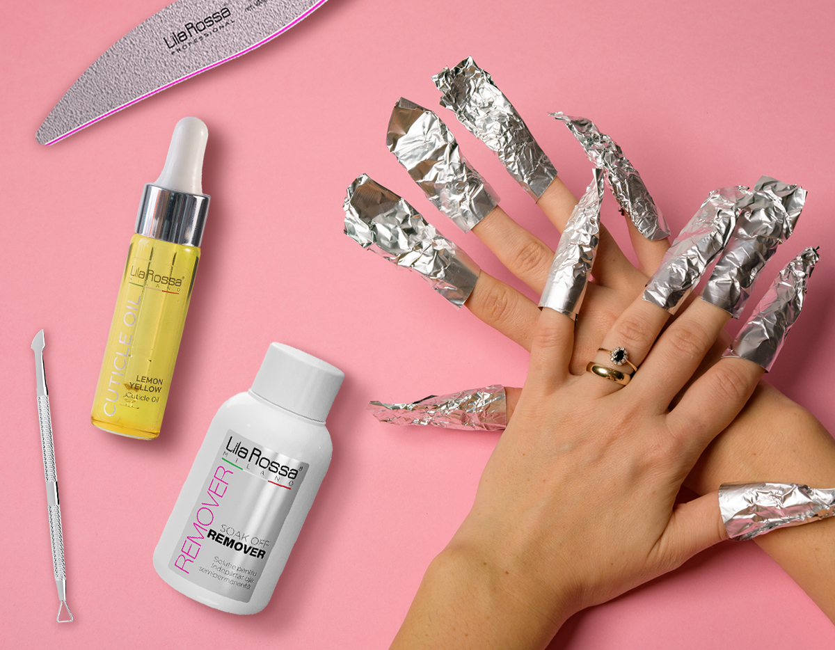 După ce timpul s-a scurs, înlăturăm folia de aluminiu și dischetele. Cu ajutorul unui instrument special sau cu un betisor pentru cuticule, înlăturăm fragmentele de oja. Cel mai probabil, aceasta se va desprinde destul de ușor.