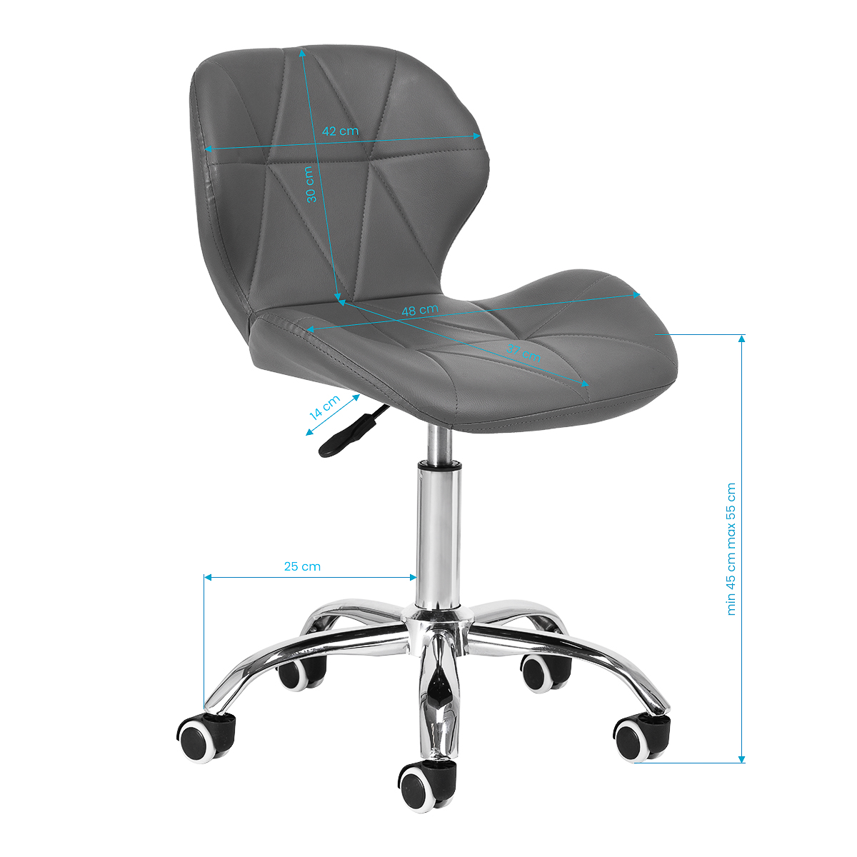 O vă permite să reglați cu ușurință înălțimea scaunului între 42-54 cm. Acest lucru vă permite să reglați scaunul la nevoile individuale și serviciile efectuate, asigurând un confort ridicat de utilizare – fie că este vorba de machiaj, stilizare a sprâncenelor sau alte activități. Spătarul conturat oferă suport adecvat pentru spate. Scaunul este echipat cu un mecanism de rotație completă, care îmbunătățește eficiența și confortul la locul de muncă.