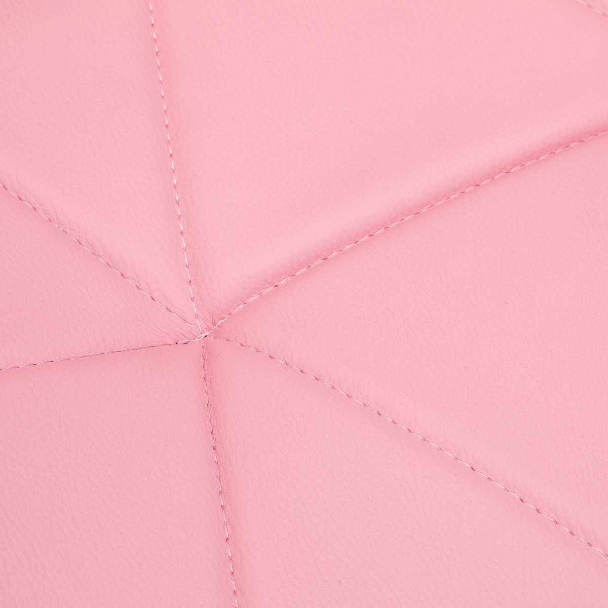 Baza cu cinci stele în nuanțe de aur este echipată cu roți din plastic, oferind o mobilitate considerabilă și permițând mobilierului să se miște liber în jurul locului de muncă. Scaunul este tapitat cu piele ecologică plăcută la atingere într-o nuanță elegantă de roz. Materialul garantează durabilitatea, rezistența la umiditate și ușurința în curățare. Designul este completat de cusături elegante, accentuând aspectul modern.