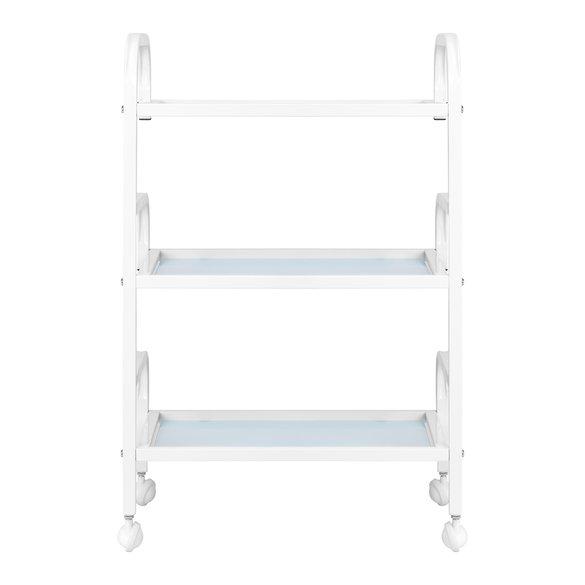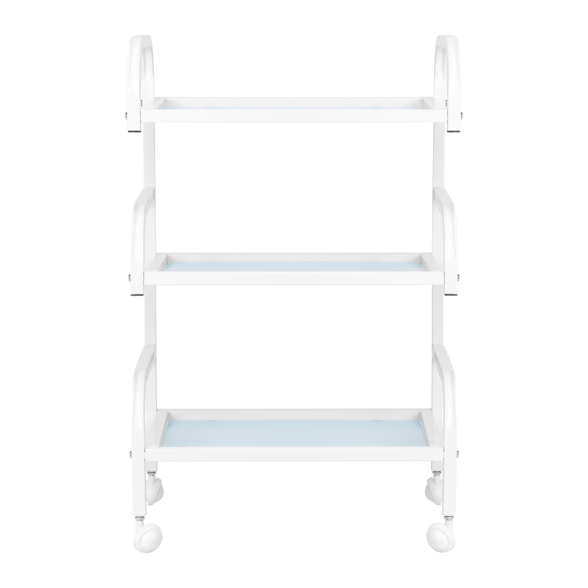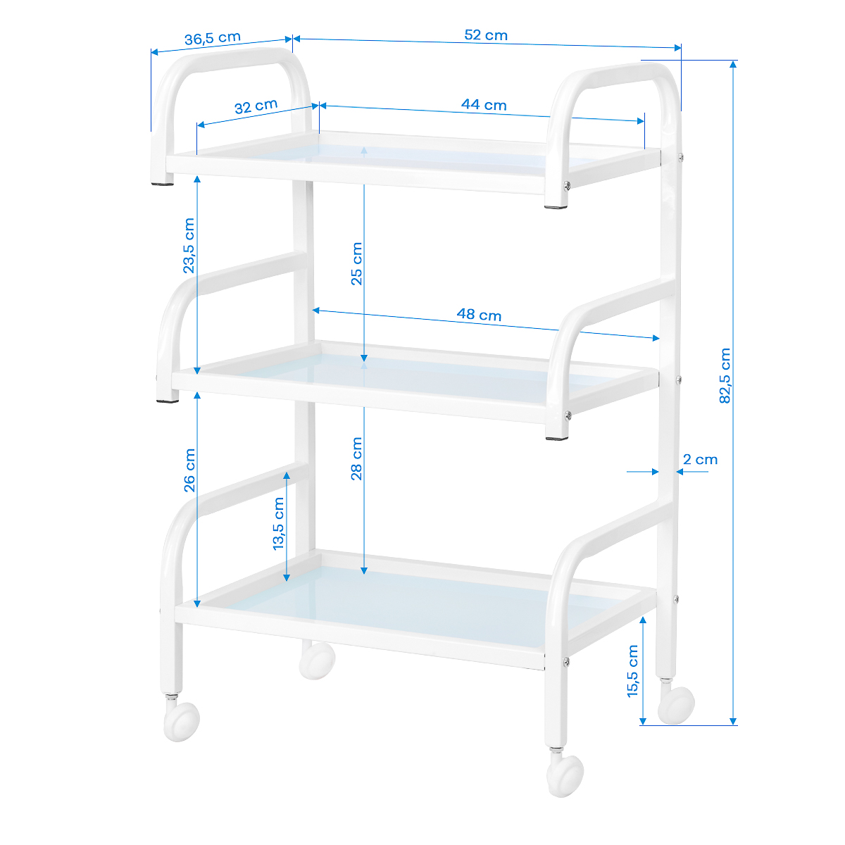 The frame made of durable aluminum in shades of white and the glass shelves create a modern and aesthetic whole that is easy to keep clean. Four wheels ensure mobility for easy organisation of the workspace, while solid materials guarantee stability and durability of use.
