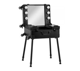 A functional cosmetic box in the form of a comfortable, portable suitcase on wheels. The perfect solution for mobile beauticians or make-up artists. Very roomy. It has four telescopic legs, thanks to which we can properly adjust the height of the station. Lighting on the sides of the mirror....