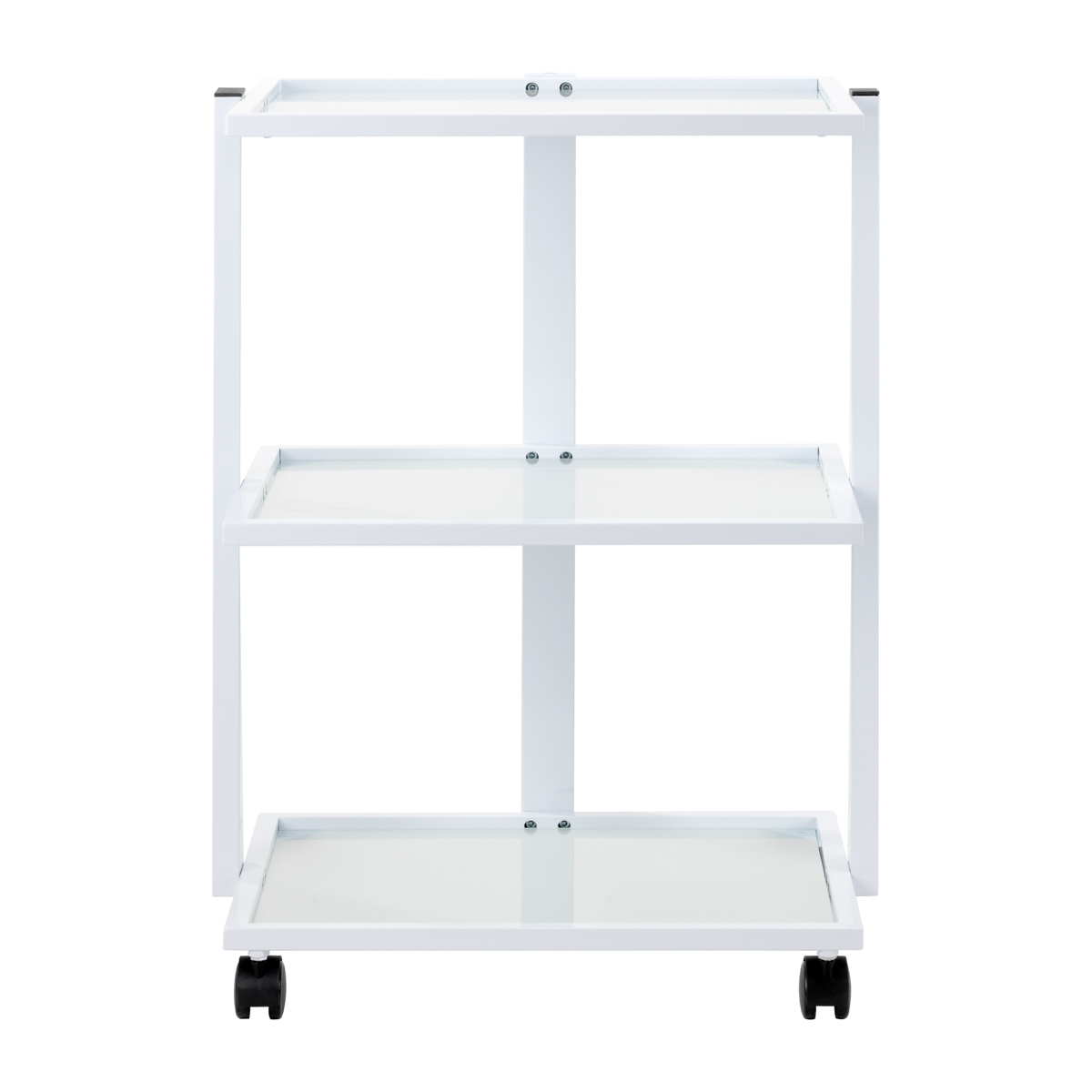 Construcția simplă, un cadru din aluminiu durabil în nuanțe de alb și rafturile din sticlă combină eleganța cu practicitatea, asigurând durabilitatea și stabilitatea mobilierului. Suprafețele netede facilitează menținerea curățeniei mesei, iar cele patru roți permit deplasarea liberă, ceea ce crește confortul de lucru în salon. Finisajul elegant subliniază caracterul profesional al interiorului. Există un loc special pe cadru pentru montarea ușoară a unei lămpi profesionale de mărire.