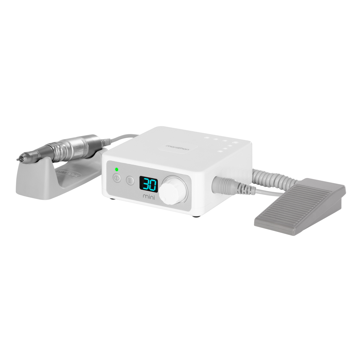 Accesoriile incluse în set asigură nu numai siguranța, ci și confortul de utilizare. Mașina de frezat unghii este echipată cu un drive de picior, permițând controlul precis al funcționării capului și lucrul liber și confortabil datorită posibilității de a controla dispozitivul fără a folosi mâinile. În timpul lucrului, capul poate fi plasat în siguranță pe soclu de silicon dedicat inclus în set. Locul pentru frezele de unghii de pe carcasă vă permite să pregătiți uneltele necesare pentru a le avea la îndemână în timpul lucrului. Protecția împotriva suprasarcinii cu semnalizare LED de avertizare protejează motorul de supraîncălzire, ceea ce asigură o mai mare siguranță operațională și protejează împotriva deteriorării dispozitivului.