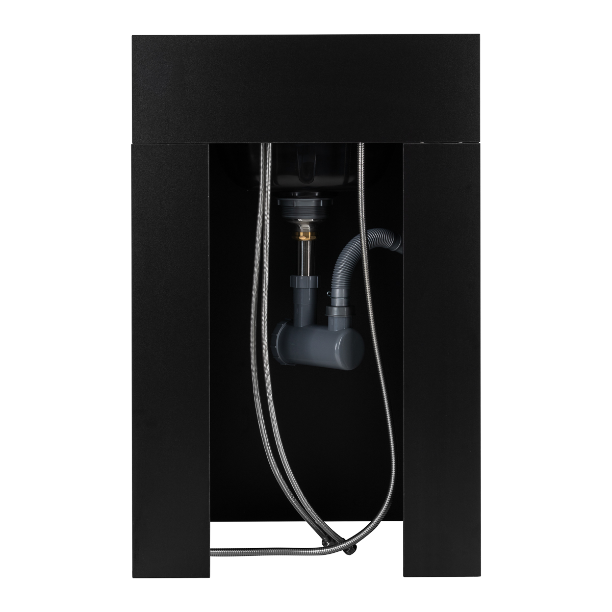 The side door provides easy access to the installation and allows storage of the most necessary products in a discreet way. The rear hole for the water connection allows for convenient and aesthetic connection of the station, while at the same time making it possible to hide the pipes and drain, which promotes maintaining order and a professional appearance of the station. The compact form of the furniture makes it ideal for both large salons and smaller spaces.