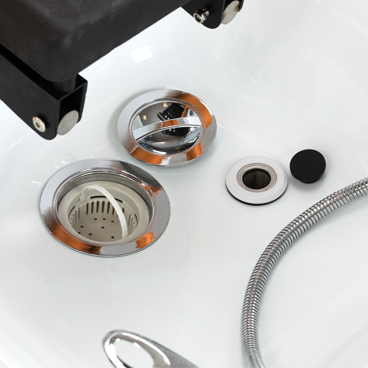 The wash unit is equipped with a mixer tap, allowing for precise adjustment of water temperature to the client's needs. A dedicated space for the shower head improves efficiency, while a chrome-plated plug with a special strainer ensures water flow control and maintains a high level of hygiene. The water connection is located inside the base, behind the fabric, aesthetically concealing the plumbing and giving the entire unit an elegant look. The ergonomically contoured bed ensures comfort during various beauty treatments. A practical pouffe complements the unit, increasing staff comfort and enhancing the functionality of the unit. These features make the wash unit ideal for both hair and SPA salons.