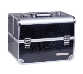 Geanta makeup pentru cosmetice, Lila Rossa, medie cu clapeta si cheie, neagra-argintie, 32x23x26 cm Geanta din aluminiu cu invelis piele ecologica. Ideala pentru make-up artisti, nail-artisti sau hairstilisti, fiind foarte incapatoare si usor de transportat. Geata este compusa din 4...