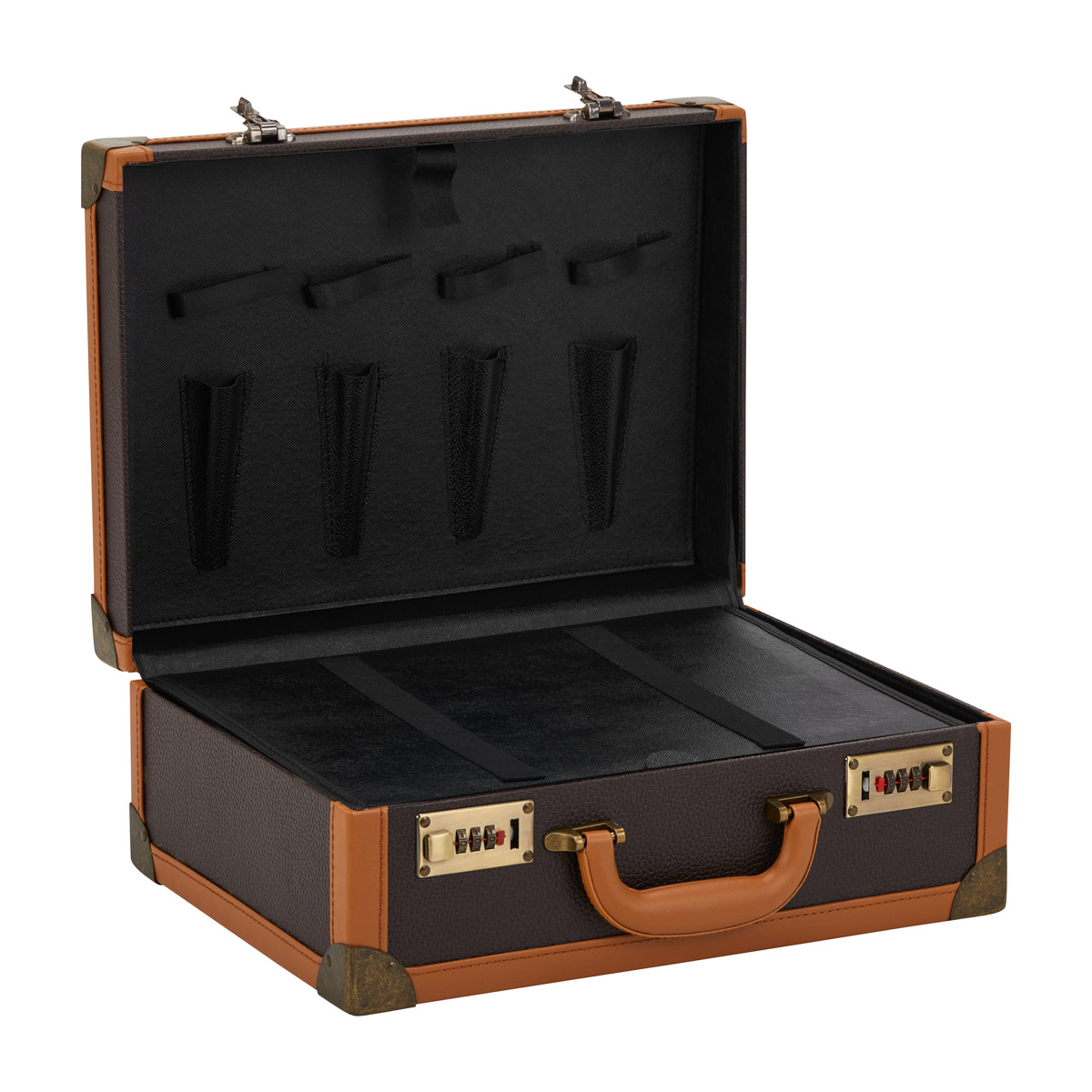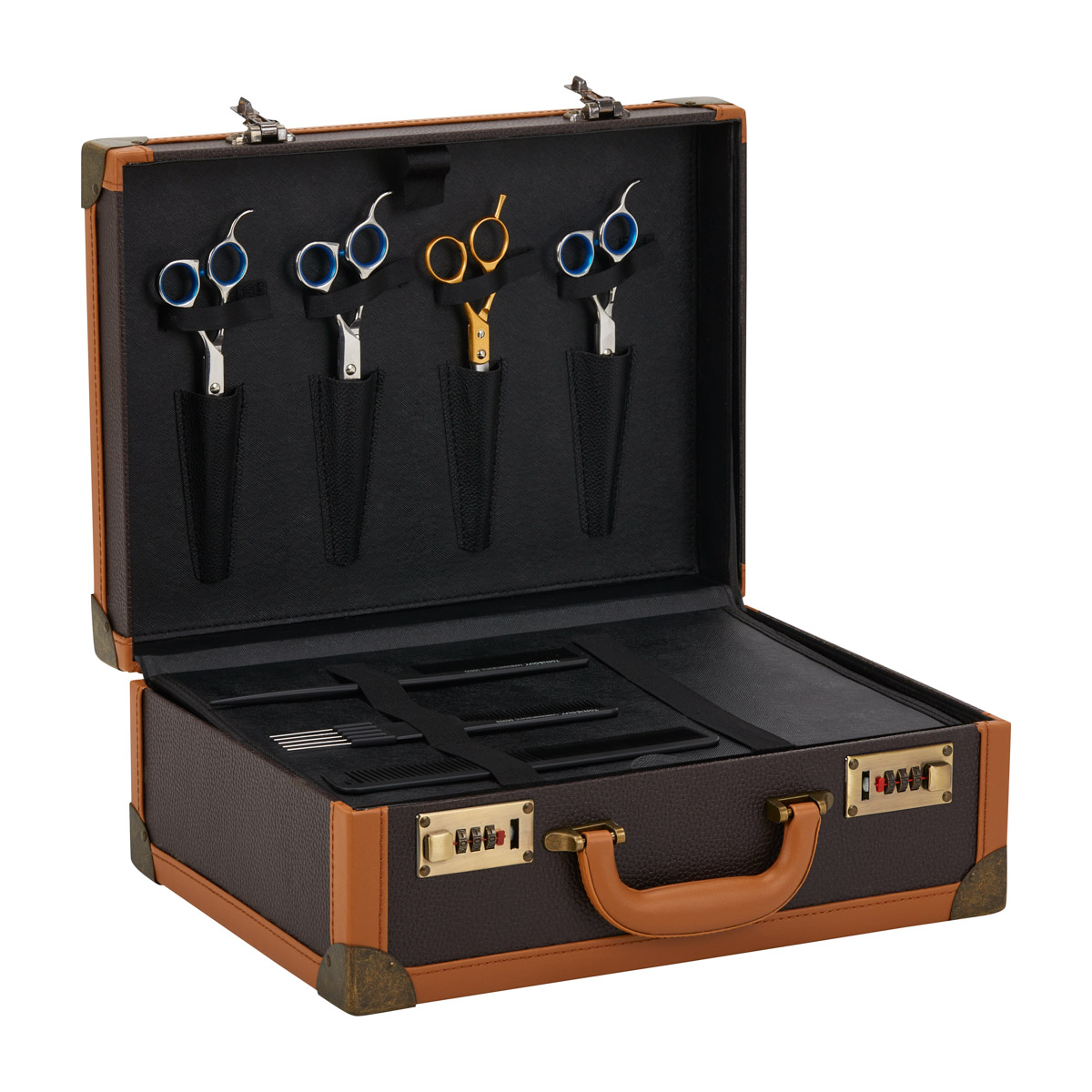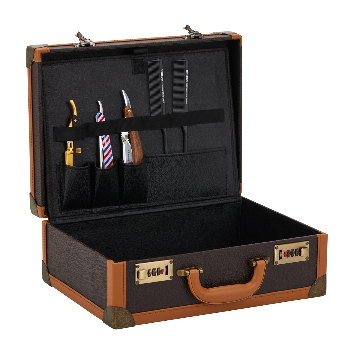 Geantă de coafat elegantă cu dublă blocare cu combinație și mâner convenabil.