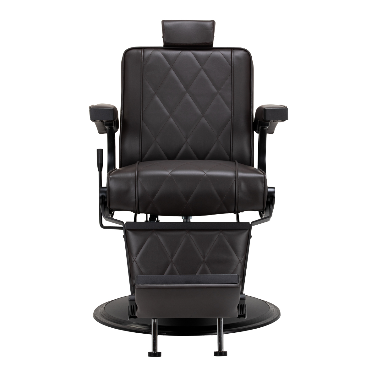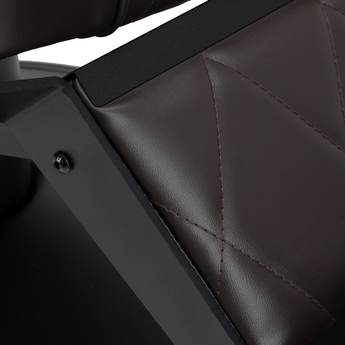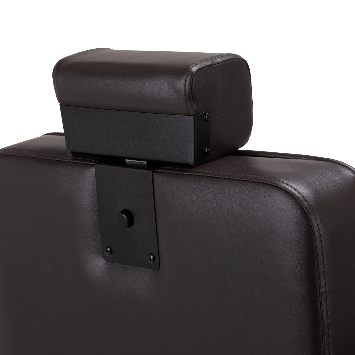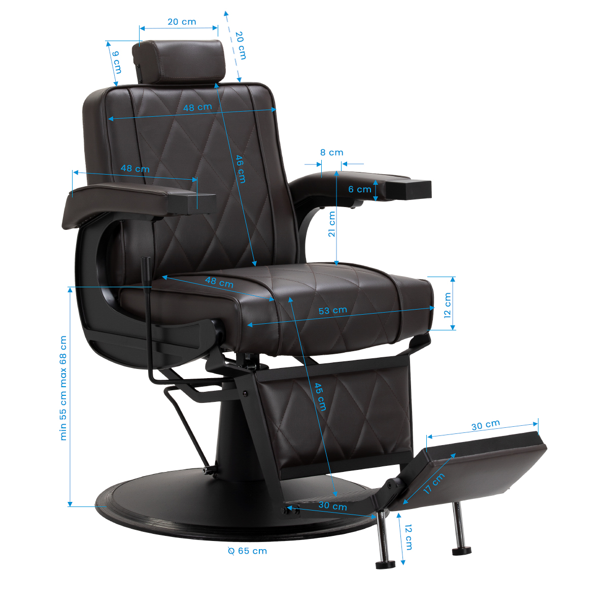 The chair's solid round base construction ensures stability and excellent user comfort. The seat filling, made of deformation-resistant foam, and the upholstery crafted from soft-touch synthetic leather with a matte finish ensure long-lasting durability and comfort during prolonged use. Stylish stitching on the upholstery adds character, evoking automotive design inspirations that enhance its elegant appearance. This feature also makes the chair moisture-resistant, durable, and easy to clean. The upholstery in brown tones gives the chair a unique character, and its minimalist style allows it to blend seamlessly with the decor of any barbershop.