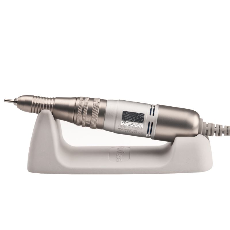 The functional H200 handpiece fits perfectly in the hand, which guarantees high comfort of work. It is equipped with an easy-to-use Twist-Lock system, which allows for quick and smooth drill bit changes. Thanks to this, working with the device is extremely easy and intuitive, which will also be appreciated by more demanding users. Pen is properly balanced and ergonomically profiled, and in addition, the vibrations of the handpiece have been reduced, so that even many hours of work with the nail drill do not tire the hand excessively. The flexible spring cable provides high comfort of work, reaching up to 135 cm in length with significant stretching.