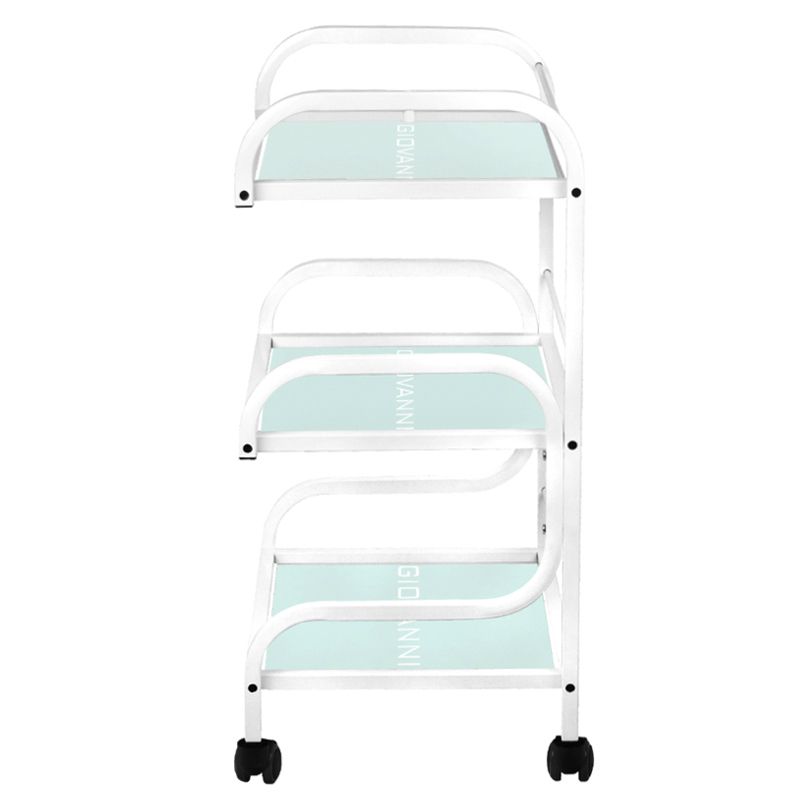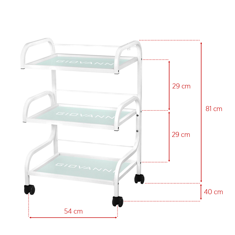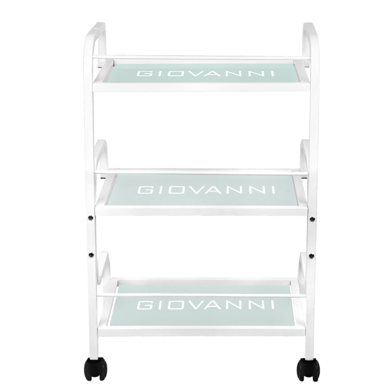 masă estetică pentru dispozitive cosmetice, realizată din metal și sticlă, cu roți. Are trei rafturi din sticlă cu logo-ul gravat Giovanni.