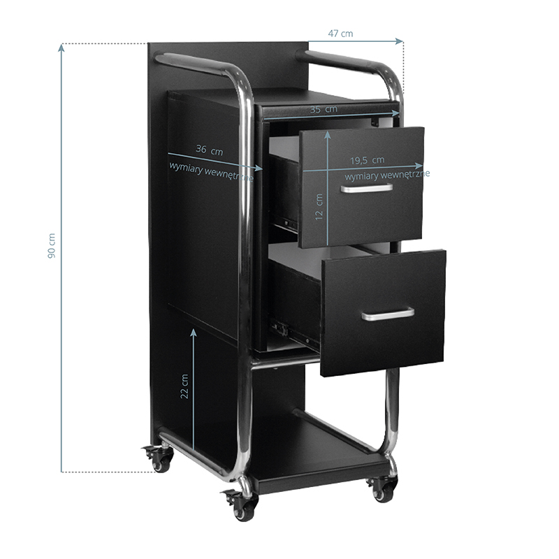 Gabbiano Solo asistent pentru coafură de înaltă calitate este o piesă elegantă de echipament, care îmbunătățește semnificativ munca în salonul de coafură. Două sertare spațioase și două rafturi de dimensiuni diferite facilitează semnificativ organizarea produselor și a instrumentelor necesare. Rotițe cauciucate cu frâne asigură mobilitatea adecvată, permițând plasarea mobilierului oriunde în salonul de coafură. Design elegant - elemente metalice lustruite în nuanțe de argint și structură stabilă din plăci de lemn în nuanțe de negru - vor sublinia perfect caracterul interiorului.