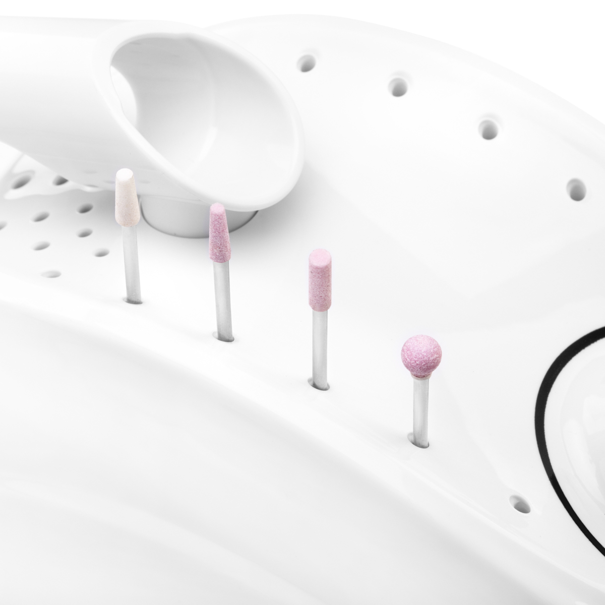 Piesa de mână a acestei mașini de frezat unghii este cu adevărat solidă și atinge un maxim de 35.000 de rotații pe minut. O puteți controla atât prin intermediul cutiei, cât și prin intermediul pedalei atașate. Rotația inversă a piesei de mână cu un singur buton, fără oprire necesară. Puteți așeza piesa de mână pe suportul care va fi atașat la cutia de control. Construcția specială a cutiei vă permite să introduceți frezele în găuri astfel încât să fie disponibile la îndemână.