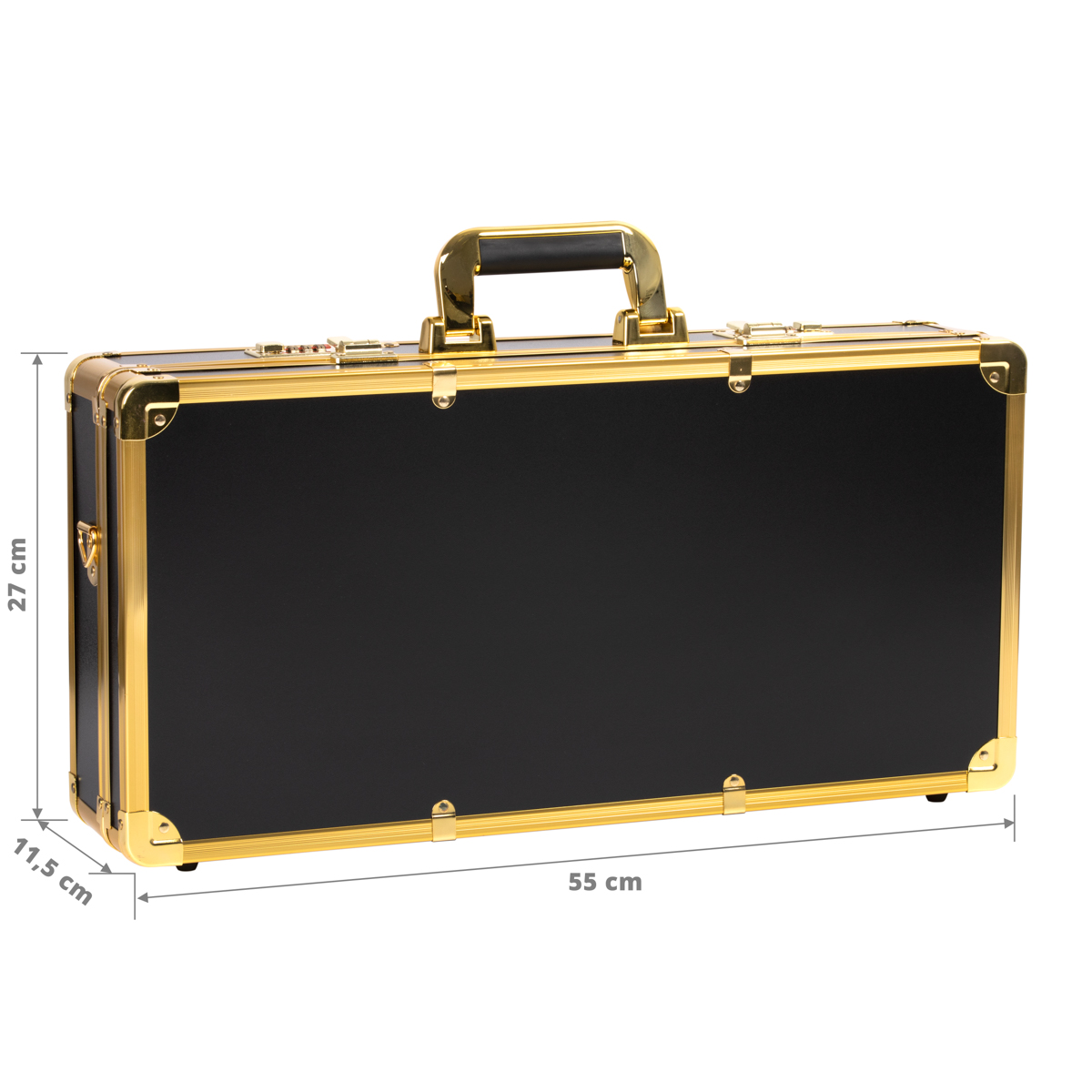Geantă de bărbier din aluminiu cu dublă blocare cu cifru și mâner confortabil. Geanta poate găzdui diverse accesorii și unelte de coafură - foarfece, piepteni, perii de păr, uscător de păr, mașini de tuns, etc. Geanta vine cu o curea de umăr detașabilă.