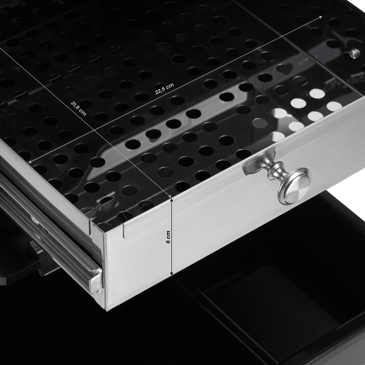 Organizatorul spațios este echipat cu un set de tăvi de depozitare care va ajuta să asiguri ordinea în locul de muncă, sortând uneltele necesare pentru munca coaforului. Setul include șase containere: două fără compartimente, două cu compartimente și două înguste și mai adânci. Aranjamentul lor în organizator poate fi schimbat liber după cum dorești pentru a se potrivi nevoilor tale, iar o selecție largă de diferite tipuri de sertare îți permite să separi ustensilele la discreția ta. În plus, cele două cuvele cele mai adânci pot fi plasate la înălțimi diferite pe laturile asistentului, astfel încât ustensilele plasate în ele vor fi întotdeauna la nivelul potrivit.