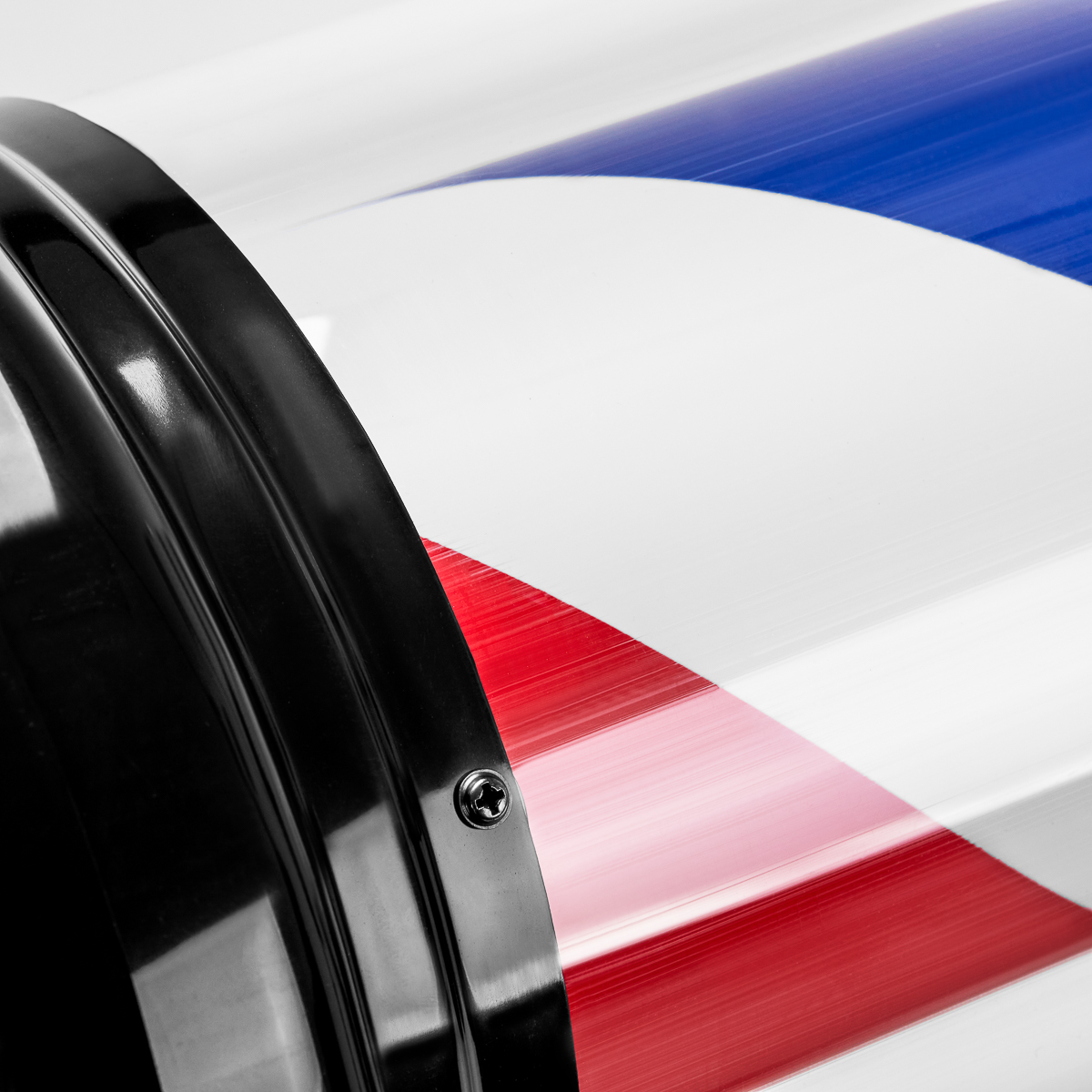 Un plafon iluminat atrăgător, echipat cu un cilindru rotativ, este o reclamă excelentă pentru un salon de bărbierit. Designul distinctiv, cu elemente rotative în roșu, alb și albastru, creează o carte de vizită unică, înțeleasă internațional, a salonului de bărbierit. Utilizând telecomanda cu fir, puteți porni atât iluminatul, cât și rotația plafonului.