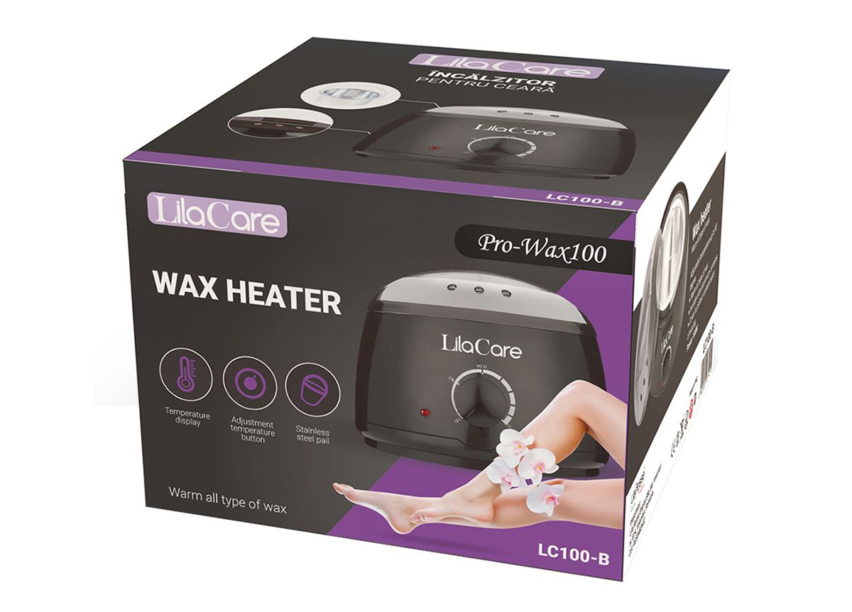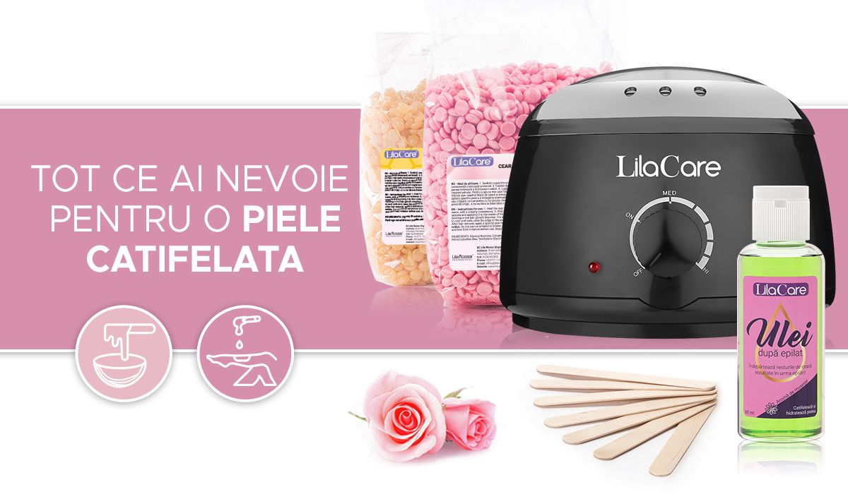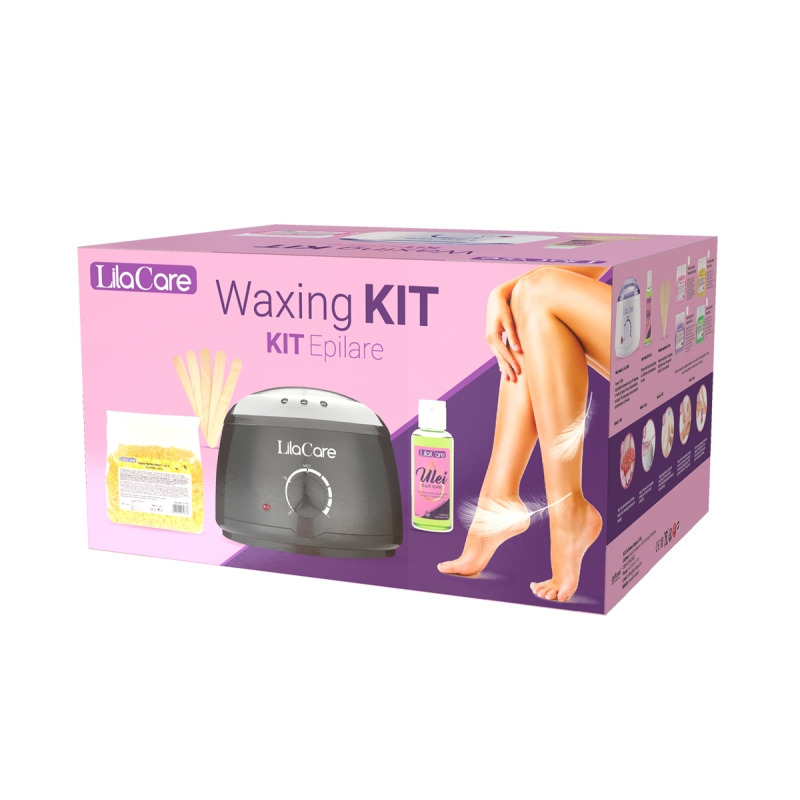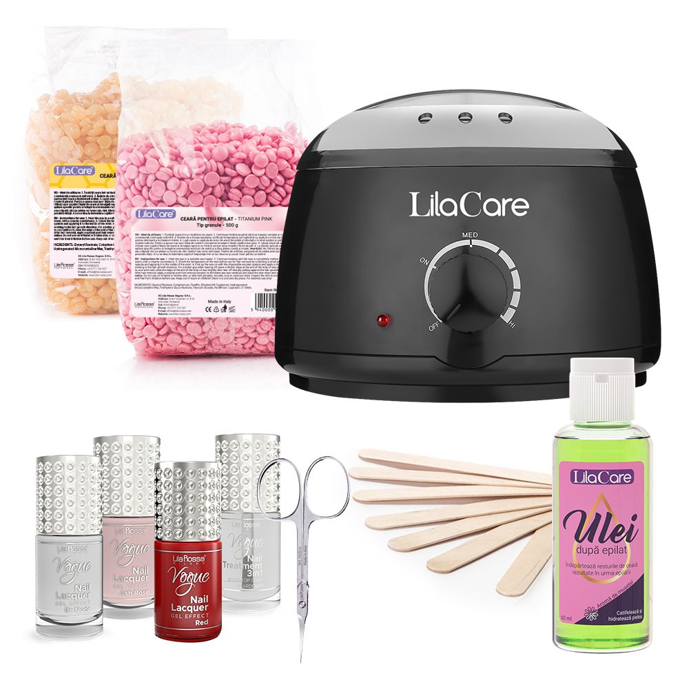 Kit epilare Lila Care cu ceara granule 2 x 500 g, 1 x incalzitor ceara negru, 1 x ulei dupa epilare, 1 x set 10 spatule, 1 x Set 3 oje clasice + tratament 3 in1, 1 x forfecuta cuticule Vogue