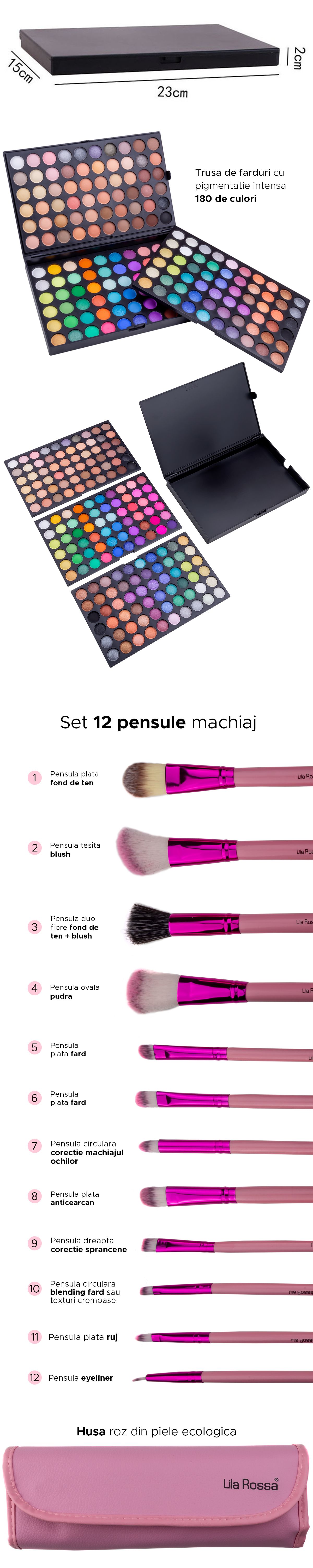 Set de machiaj “I am Fabulous” format din trusa de farduri cu pigmentatie deosebita cu 180 culori si 12 pensule de calitate superioara, este tot ce ai nevoie pentru ca tu sa arati fabulos indiferent de ocazie.