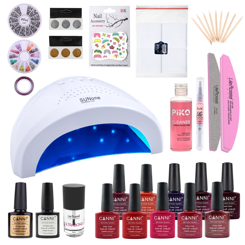 La magazinul de manichiura cel mai apropiat de tine nu găsești Kit oja semipermanenta Canni, Fall Season, lampa uv-led sunone 48 W + 10 oje Canni + baza + top?