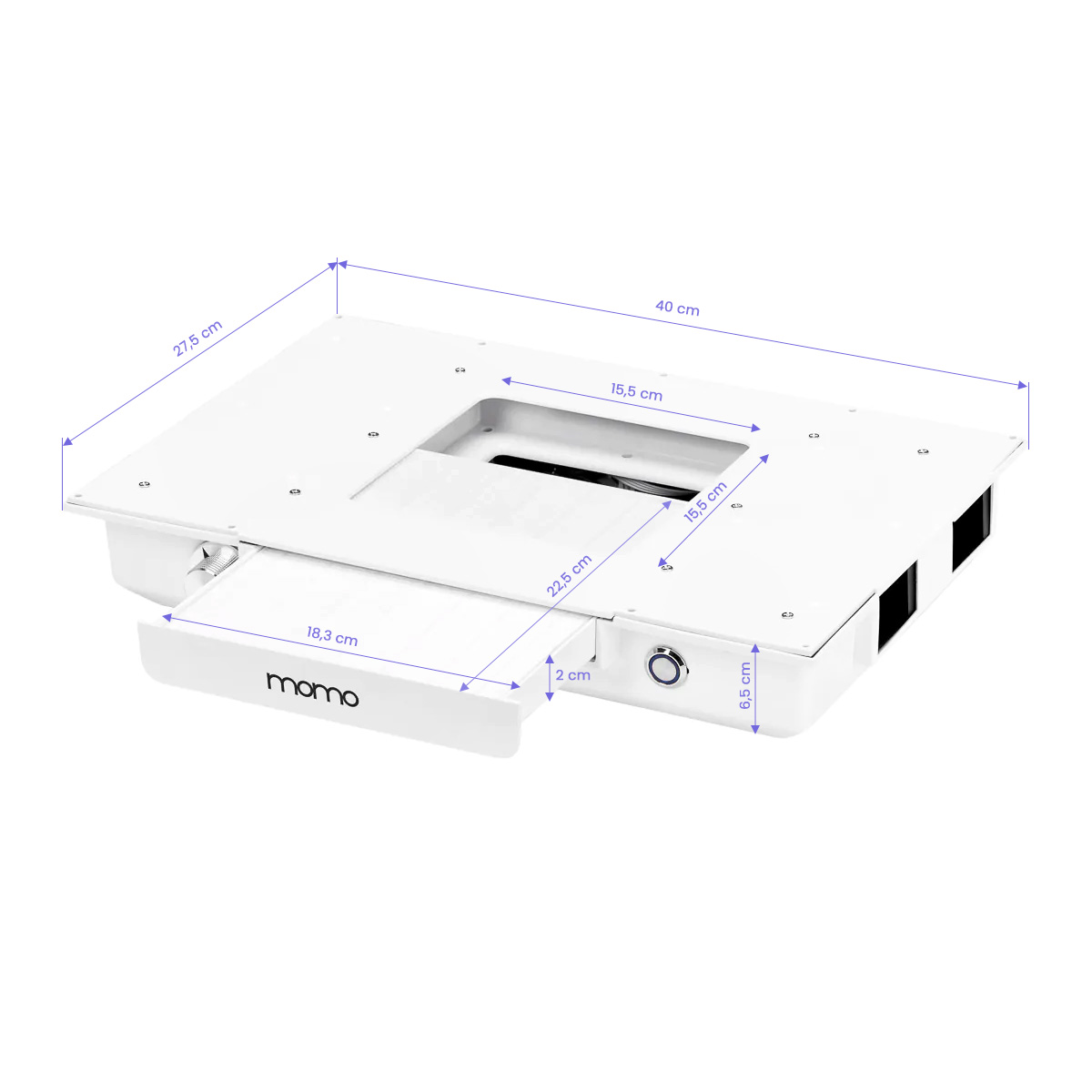 The Momo J-02 cassette dust collector built into the countertop significantly improves the comfort and hygiene of work, effectively removing dust generated during beauty treatments, such as manicures. Thanks to this device, the air in the salon remains clean and the workplace free from pollution, which increases the safety of both the beautician and clients. The dust collector is easy to use and maintain, which additionally enhances its functionality. Regular cleaning and filter replacement ensure consistently high absorption efficiency. It is possible to purchase additional replacement filters (SKU 123581).