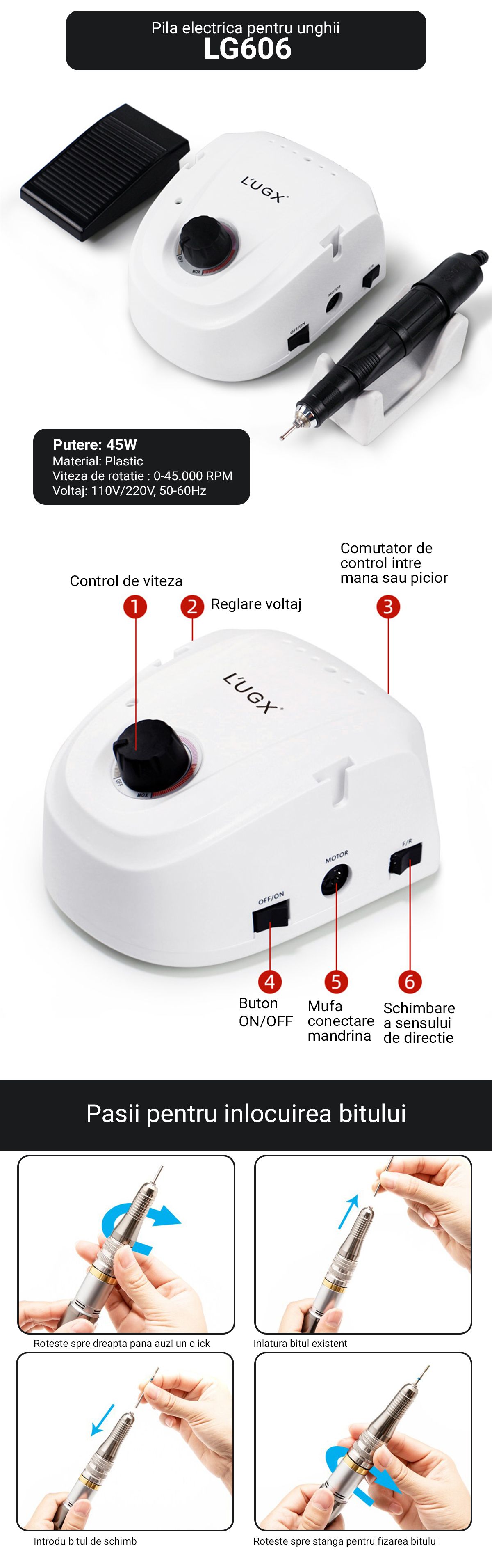 La magazinul de manichiura cel mai apropiat de tine nu găsești Pila electrica, freza unghii, L’UGX, alba, 45.000 rpm, 45 W?
