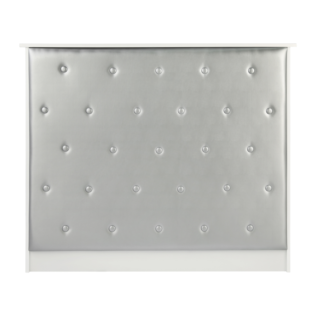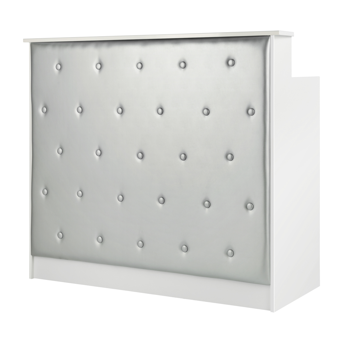 Această piesă de mobilier este fabricată din placaj laminat de înaltă calitate, durabil, în nuanțe de alb, iar suprafețele netede sunt ușor de curățat - în caz de murdărie, doar ștergeți-le cu un șervețel umed. Partea frontală decorativă a fost tapițată cu piele sintetică în nuanțe de argint, ceea ce îi conferă un aspect elegant, asigură durabilitate și ușurință în curățare. Butonii decorativi adaugă în plus eleganță și unicitate, subliniind caracterul interiorului. Biroul de recepție a fost făcut cu grijă, este stabil, iar materialele folosite permit multe ani de utilizare eficientă.