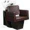spălător profesional pentru mașini de tuns - stabil, extrem de confortabil, solid construit. designul modern îl face un complement frumos pentru echipamentul unui salon de coafură modern. scaun fabricat din eco-piele de înaltă calitate, cu cusături laterale interesante. pad-ul de silicon pentru cap stabilizează capul clientului și îi permite să fie plasat convenabil pe spălător. bolul Myki alb, cu posibilitatea de a-și regla înclinația. spălător negru și maro