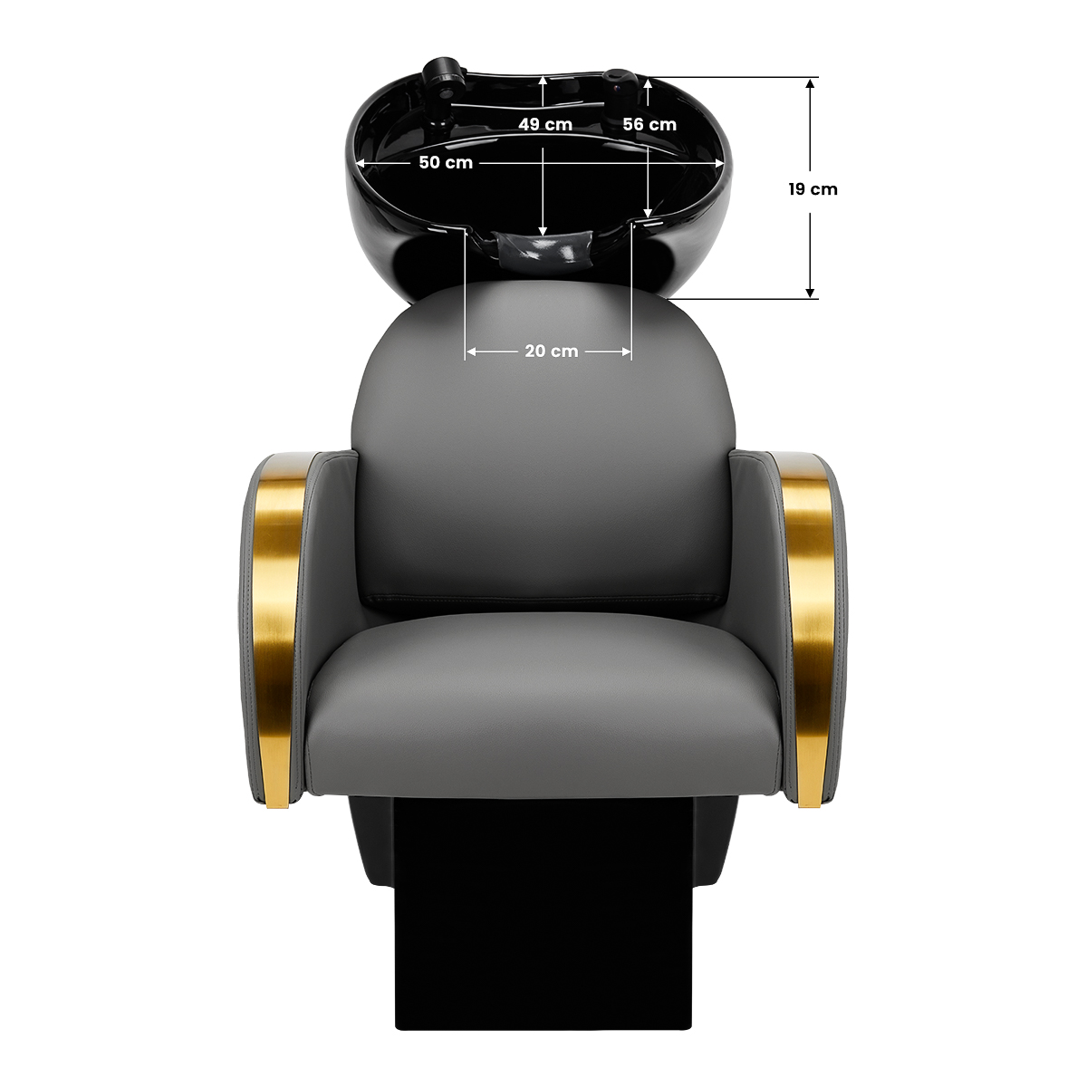 Cuva ceramică cu adâncime adecvată în nuanțe de negru previne stropirea excesivă a apei și a produselor utilizate în timpul tratamentului. Permite efectuarea confortabilă și eficientă a unei game largi de servicii. Mobilitatea cuvei vă permite să ajustați ușor unghiul de înclinare la nevoile individuale. Materialul folosit face ca chiuveta să fie durabilă, rezistentă la decolorare și zgârieturi și foarte ușor de curățat. Un guler profilat corespunzător oferă suport și confort optim în timpul spălării părului, iar o husă de plastic confortabilă în nuanțe de negru face ca clientul să nu simtă neplăcerea suprafeței reci de ceramică.