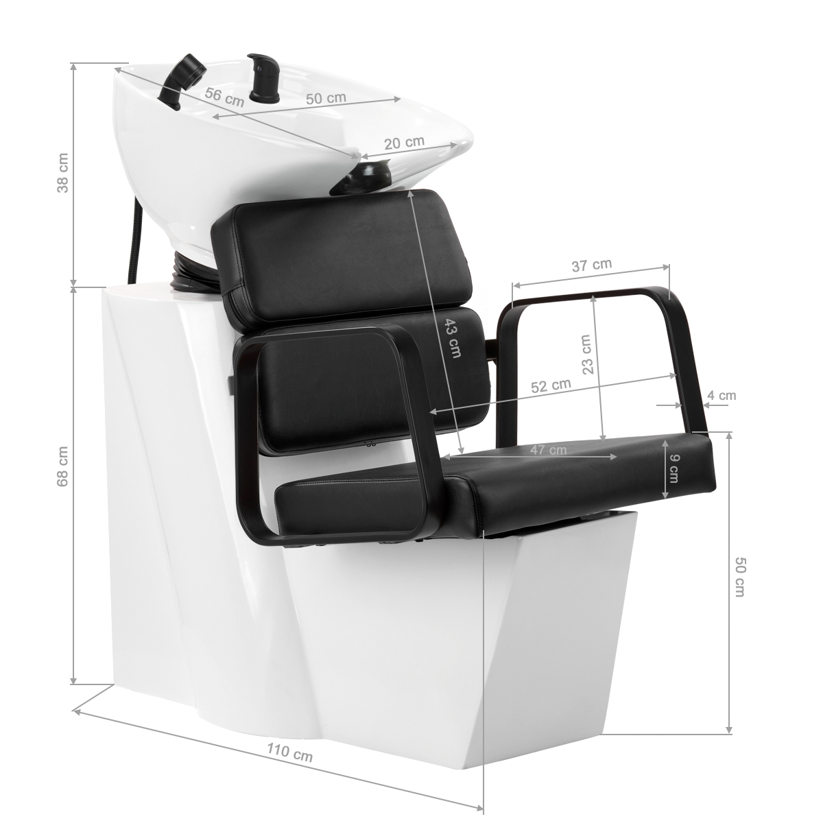 Scaunul profilat oferă suport lombar adecvat și, prin urmare, un confort ridicat de utilizare. Brațele metalice în nuanțe de negru cu formă geometrică permit poziționarea corectă a umerilor clientului. Umplutura cu spumă durabilă, rezistentă la deformare și tapiteria din piele sintetică plăcută la atingere în nuanțe de negru asigură durabilitatea mobilierului, ușurința de curățare și utilizarea confortabilă pentru o perioadă îndelungată. Aspectul original și elegant al unității de spălat părul conferă interiorului o expresie unică. Setul include furnituri complete în nuanțe de negru, inclusiv un robinet, un cap de duș și furtunuri dedicate pentru a oferi un set complet de instrumente pentru muncă.