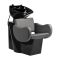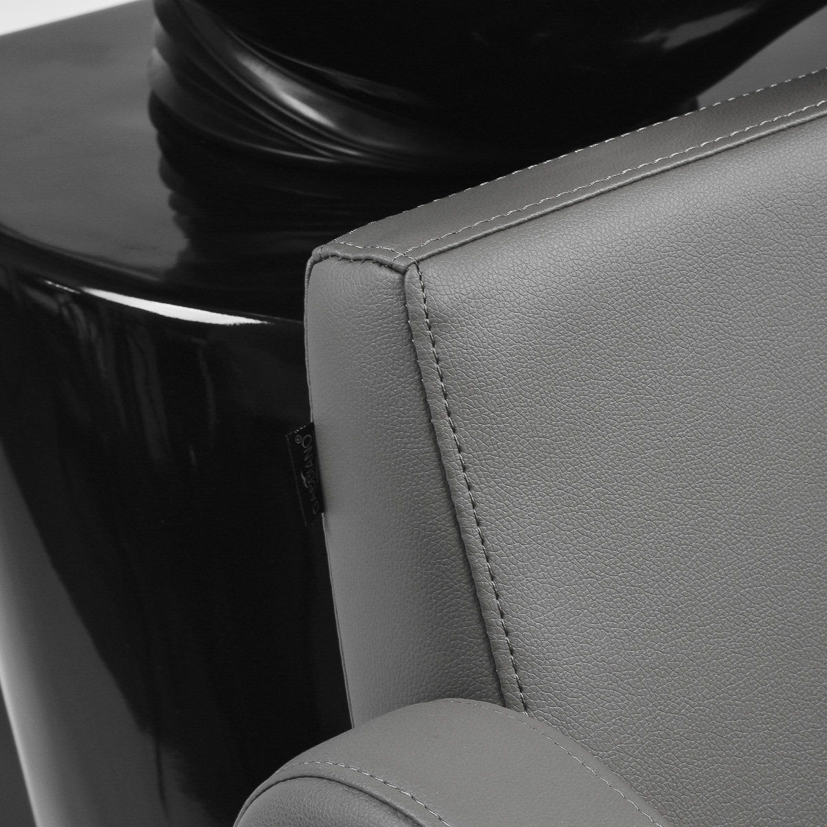 The deep ceramic bowl in shades of black reduces splashing of water and products used during treatments. The adjustable bowl tilt allows for customization to suit individual needs, and the material used makes the sink durable, resistant to stains and scratches, and easy to keep clean. The ergonomically profiled collar provides comfortable head support, while the soft black plastic cover eliminates the feeling of coldness from the ceramic surface.