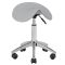 Scaun cosmetic confortabil, stabil, fara spatar, cu un sezut profilat, pe o baza cu cinci stele cu roti cauciucate, culoare gri, piesa necesara de mobilier intr-un salon de infrumusetare.