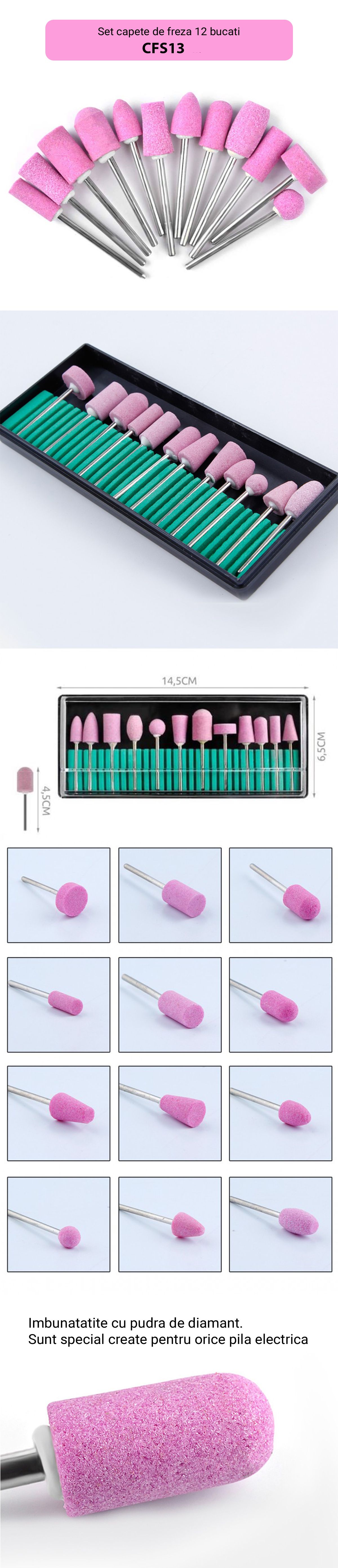 Setul include 12 capete ceramice ce sunt utilizate impreuna cu freza electrica.