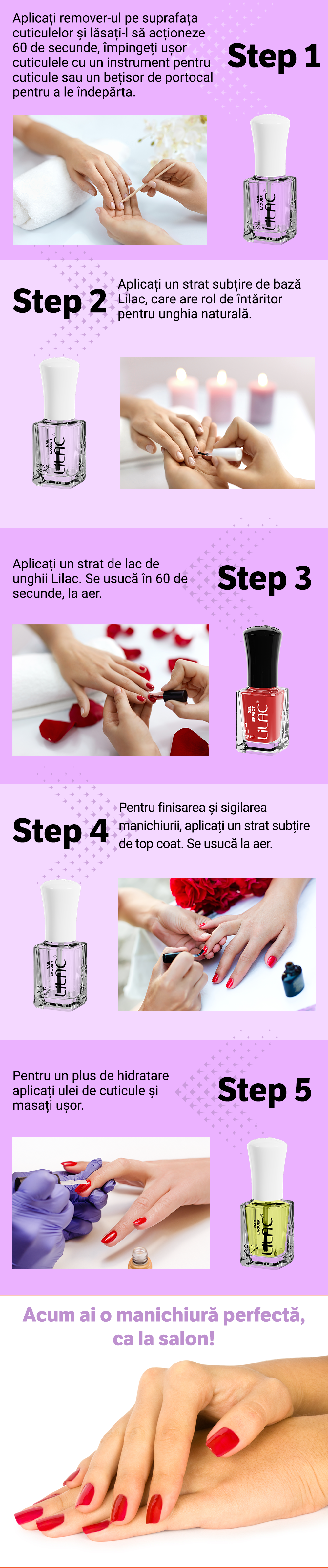 Aplicati remover-ul pe suprafata cuticulelor si lasati-l sa acționeze 60 de secunde, impingeti usor cuticulele cu un instrument pentru cuticule sau un betisor de portocal pentru a le indeparta.
