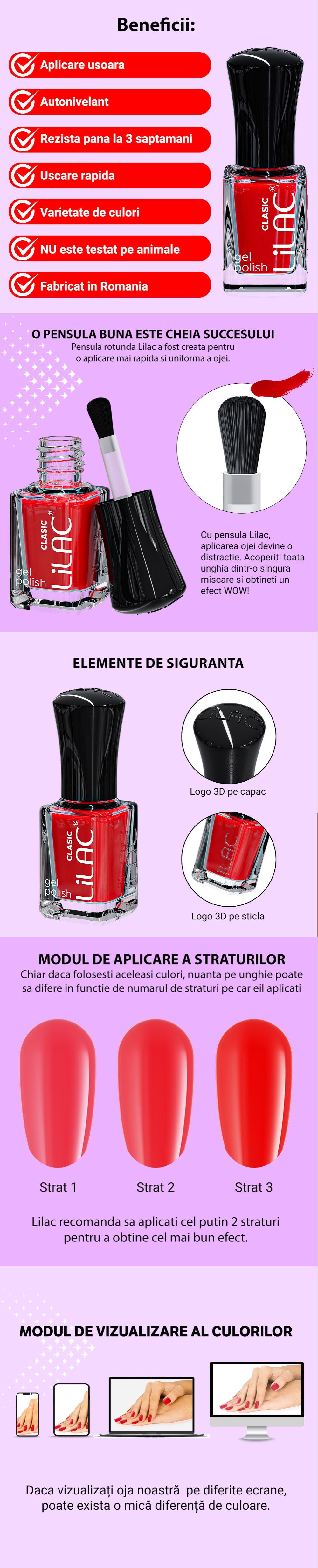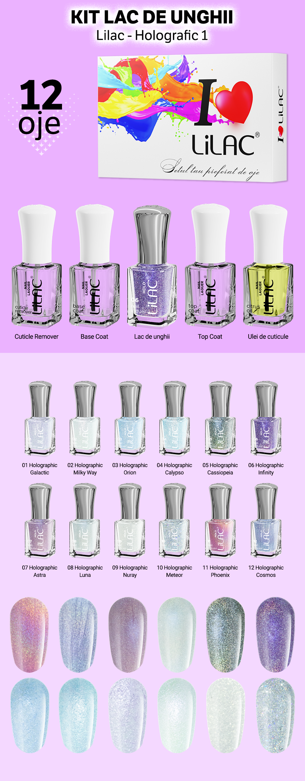 Setul de lac de unghii Lilac, Holographic cuprinde 12 culori superbe pentru o manichiura perfecta. Lacul de unghii Lilac are o textura matasoasa, cu acoperire maxima, care asigura rezistenta de durata pe unghii, uscare rapida si luciu puternic. Este necesara aplicarea a doar doua straturi pentru o nivelare perfecta si o culoare puternica. Se usuca in aer, cate 60 de secunde pentru fiecare strat aplicat, oferindu-ti o manichiura eleganta. Tratamentul de unghii te va ajuta sa ai unghii sanatoase si tari.