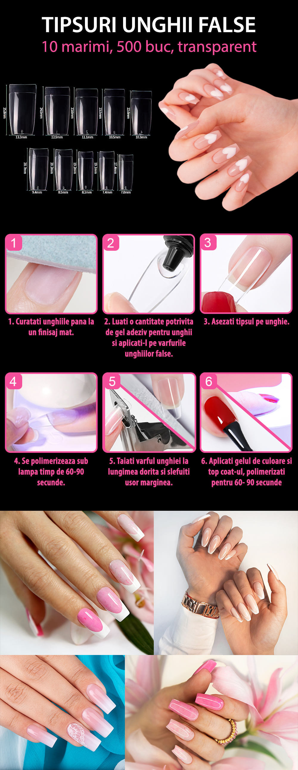 Se lipsesc usor pe unghia naturala si au diferite dimensiuni pentru a se potrivi fiecarei forme de unghie.