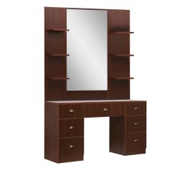 An elegant brown barber console with brass trim. A large mirror, shelves and drawers ensure functionality. Top-class finish. A nice piece of furniture and, at the same time, a universal element of the interior, which will emphasize the character of each living room.
