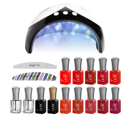 Kit oja semipermanenta Lilac, 14 oje, 10 Red Colors + Top Coat + Base Coat + Nail Prep + Ultrabond, Lampa 36 W, pila unghii si buffer Lampa UV Liliac 36W asigura o polimerizare rapida si eficienta a ojelor semipermanente si a gelurilor UV, indiferent de pigmentare sau tip de...