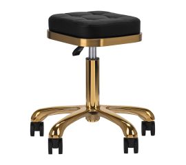 A unique cosmetic stool in black, with a quilted seat and a gold-colored metal finish. It is height-adjustable and has a thrust arm base equipped with solid wheels.Gold elements are coated with lacquer. Mechanical damage to the coating is not subject to complaint.