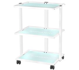 table for cosmetic devices 1040 aesthetic table for cosmetic devices, made of metal and glass, with rubberized wheels. it has three glass shelves with an engraved giovanni logo. it is possible to attach a magnifying lamp to it. dimensions: - table dimensions 55x 44 x 81 cm - glass...