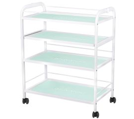functional, metal and glass table with wheels and one pull-out shelf. this stable piece of furniture is perfect as a table for cosmetic devices. has the ability to attach a magnifying lamp and other elements. table 1015a has four glass shelves with an engraved giovanni logo dimensions: -...