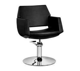 Modern hairdressing chair. Very comfortable, ideally suited to the interiors of elegant living rooms. Adjustable in the vertical plane. Very stable and solid. The upholstery is made of the highest quality black eco-leather.