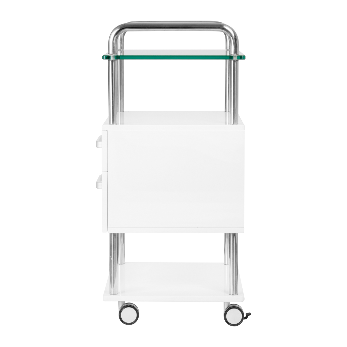 Un ajutor de pedichiură de înaltă calitate este un mobilier cosmetic funcțional pe roți. Datorită mobilității sale, îl puteți transporta în alte camere de tratament. Asistentul are un blat de lucru din sticlă, două sertare pentru unelte, accesorii și un raft pentru o mașină de frezat pentru pedichiură sau alt dispozitiv.