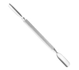 Double-sided manicure hoof. both sides of the hoof are finished with a semicircular spoon of various widths - ideal for removing cuticles. silver, grooved spindle facilitates work. suitable for disinfection.